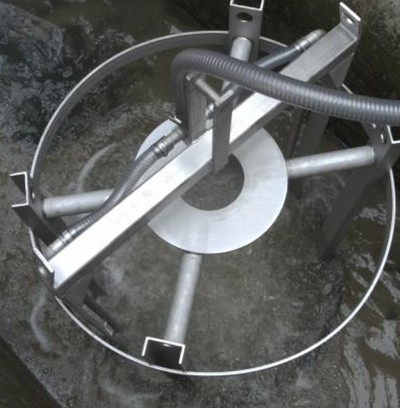 曝氣和雜質(zhì)的再循環(huán)是由在遠(yuǎn)處的操作室或室外控制柜的鼓風(fēng)機(jī)產(chǎn)生。壓縮空氣由鼓風(fēng)機(jī)通過(guò)一個(gè)壓力軟管或者不銹鋼管進(jìn)入沉砂池。一個(gè)快速的對(duì)接耦合使得空氣壓力和砂礫收集籃連接。在耦合點(diǎn)堅(jiān)硬的不銹鋼管將壓縮空氣傳送到籃子的底部,壓縮空氣吹到籃子底下通過(guò)一種特殊的曝氣系統(tǒng)形成一個(gè)空氣地毯。由于有再循環(huán)作用有機(jī)物質(zhì)的沉積可以避免,因此,這些有機(jī)物質(zhì)隨著水流流走。曝氣可以連續(xù)進(jìn)行或者根據(jù)需要由定時(shí)器控制(時(shí)間繼電器,PLC等)。